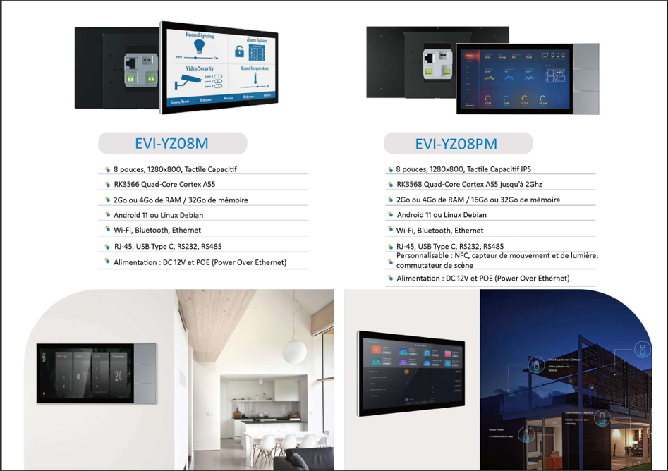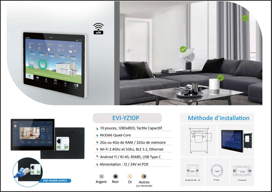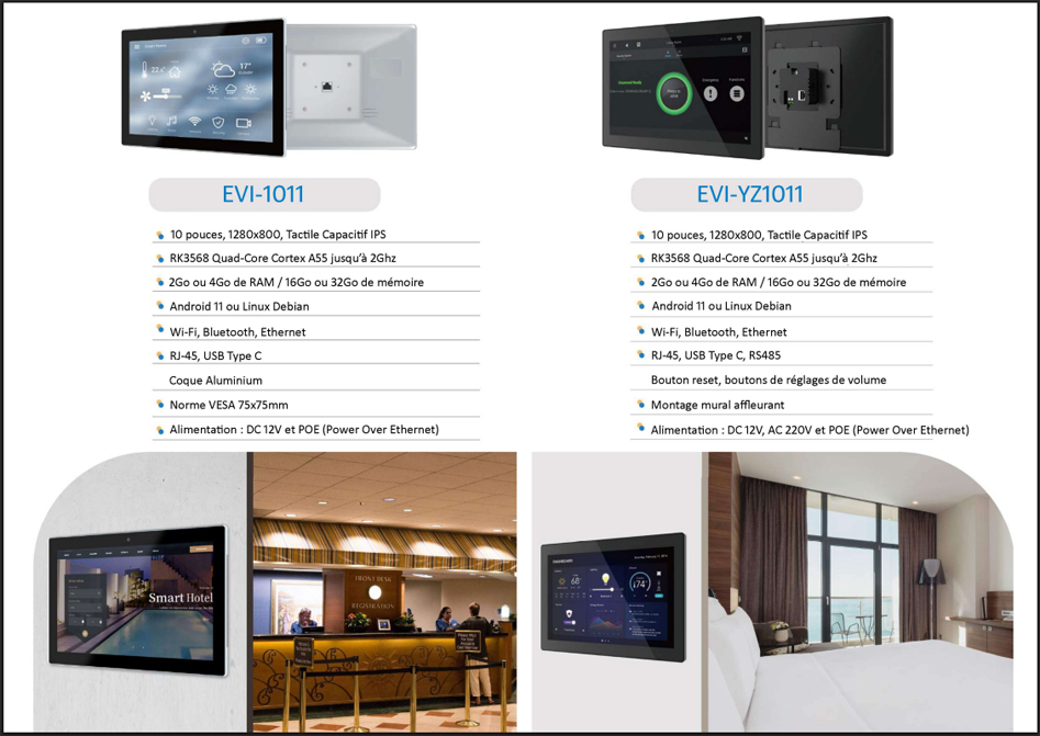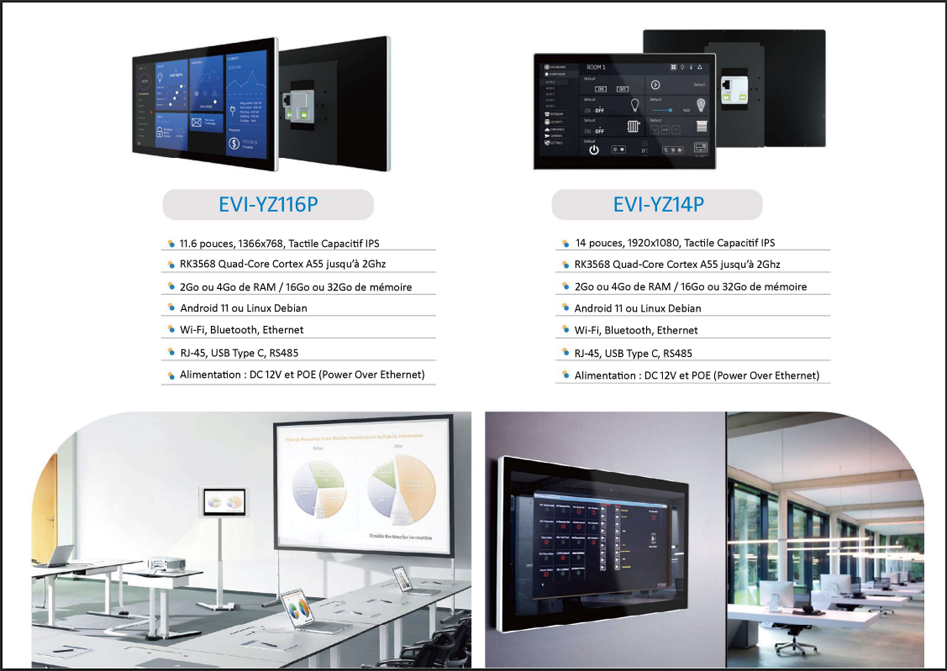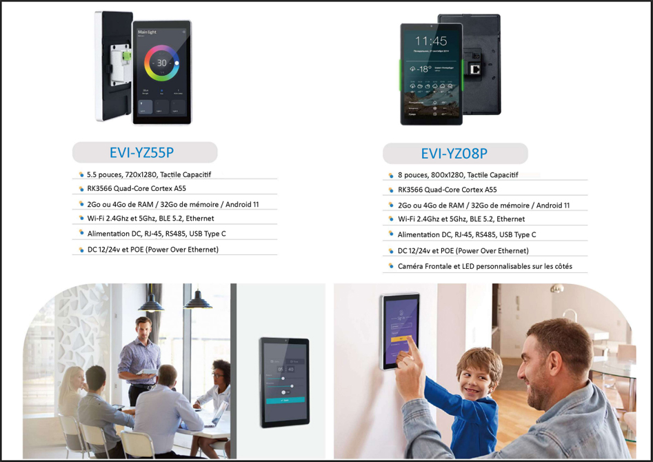 YziPanel. La première tablette VESA sous Android, avec port Ethernet POE (Power Over Ethernet, norme IEEE802.3at) conçue et assemblée en France. Une tablette de 4 à 100 pouces sous Android performante. Un support VESA pour fixation murale ou encastrable. Une tablette qui peut servir de portier, de télécommande, de contrôle domotique, ou de judas numérique. Un port Ethernet POE (Power Over Ethernet). Une tablette murale avec ou sans batterie. Entièrement aluminium et totalement unique. A partir de 399€ TTC. Innovante. EVI, société française spécialisée dans la conception hardware, présente la première tablette VESA (75mm * 75mm) Android au monde. Fixez celle-ci au mur et utilisez-là comme un afficheur d’informations tactile sous Android. Qualitative. L’YziPanel est une tablette entièrement conçue en Aluminium. Son écran tactile IPS affiche une image parfaite. Son processeur Quad-Core Rockchip allie performances et économies d’énergie. Un outil professionnel conçu pour être durable. Garantie 3 ans. Connectée. Grâce à sa prise Ethernet intégrée, l’YziPanel peut être reliée à un réseau filaire sans besoin d’adaptateur. La technologie Power Over Ethernet (POE) permet de l’alimenter directement par réseau. Il est également possible de l’allumer et de l’éteindre à distance. Une alimentation par chargeur séparé reste intégrée. Sécurisée. L’YziPanel dispose, par défaut, d’un port USB Type C. Pour des raisons de sécurité, celui-ci peut être condamné et fixé par deux vis. Vous éviterez ainsi toute instrusion de périphériques externes non autorisés. Avec sa finition aluminium et son support VESA intégré dans le chassis, l’YziPanel est également protégé contre tout risque d’arrachement. Enfin, nos solutions logicielles (root Android, ADB par TCP/IP, mise-à-jour OTA et droits d’exécutions d’app au lancement) permettent aux développeurs de personnaliser le produit. Personnalisable. Selon vos besoins, l‘équipe EVI peut entièrement personnaliser l’YziPanel. Connectiques, configurations, personnalisations, contactez-nous pour plus d’informations. La gamme YziPanel de 4 à 100 pouces est disponible dans notre catalogue. Découvrez nos autres modèles de tablettes POE (avec ou sans batterie) françaises sous Android, Windows ou Linux. Catalogue YziPanel : tablettes murales et solutions d’affichage professionnel conçu in France. Le catalogue YziPanel présente l’ensemble de la gamme de tablettes murales EVI, conçues pour les environnements professionnels tels que le bâtiment connecté, la domotique, l’hôtellerie, la santé, le retail ou l’industrie. Ces tablettes Android ou Windows se distinguent par leur conception soignée, leur fiabilité et leur compatibilité avec les systèmes d’automatisation et de contrôle les plus courants. Développées pour un usage intensif 24h/24 et 7j/7, elles sont disponibles en plusieurs formats, de 5 à 14 pouces, avec écran tactile capacitif, alimentation PoE ou 12 V, et montage mural ou encastré. Les modèles YziPanel offrent une intégration simple et esthétique grâce à un design épuré et des matériaux robustes. Chaque produit est personnalisable selon les besoins des intégrateurs : logo, firmware, connectique ou finitions. Le catalogue détaille également les options d’accessoires et de fixation ainsi que les versions spécifiques pour salles de réunion, contrôle d’accès, bornes interactives et gestion énergétique. Conçues et assemblées en France par EVI SAS, les tablettes YziPanel bénéficient d’un support technique dédié et d’une garantie 3 ans avec échange à neuf. Téléchargez le catalogue YziPanel pour découvrir l’ensemble des caractéristiques techniques, options de personnalisation et exemples d’intégration dans des projets professionnels en Europe et à l’international. The YziPanel catalog showcases the complete range of EVI wall-mounted tablets, designed for professional environments such as smart buildings, home automation, hospitality, healthcare, retail, and industry. Click here to view it. #TablettePOE #POE #FrenchTech